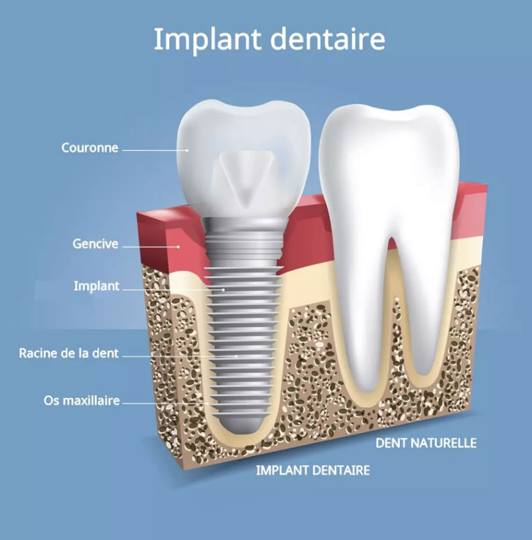 L’implant dentaire est une dispositif médical (sorte de vis en titane) inséré dans le maxillaire ou la mandibule destinée à créer un ancrage capable de recevoir une prothèse dentaire amovible ou fixée.